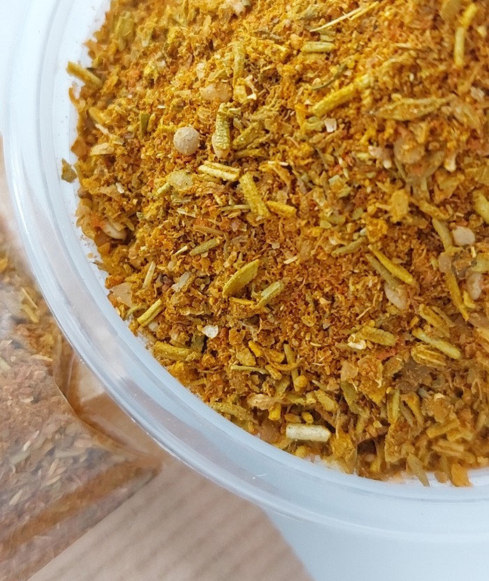 паприка, кориандр, хмели-сунели, розмарин, лимонный перец, фенхель, кардамон чёрный, куркума, орегано, тимьян, кунжут белый, сумах, майоран, карри нежная, перец чёрный, имбирь.
