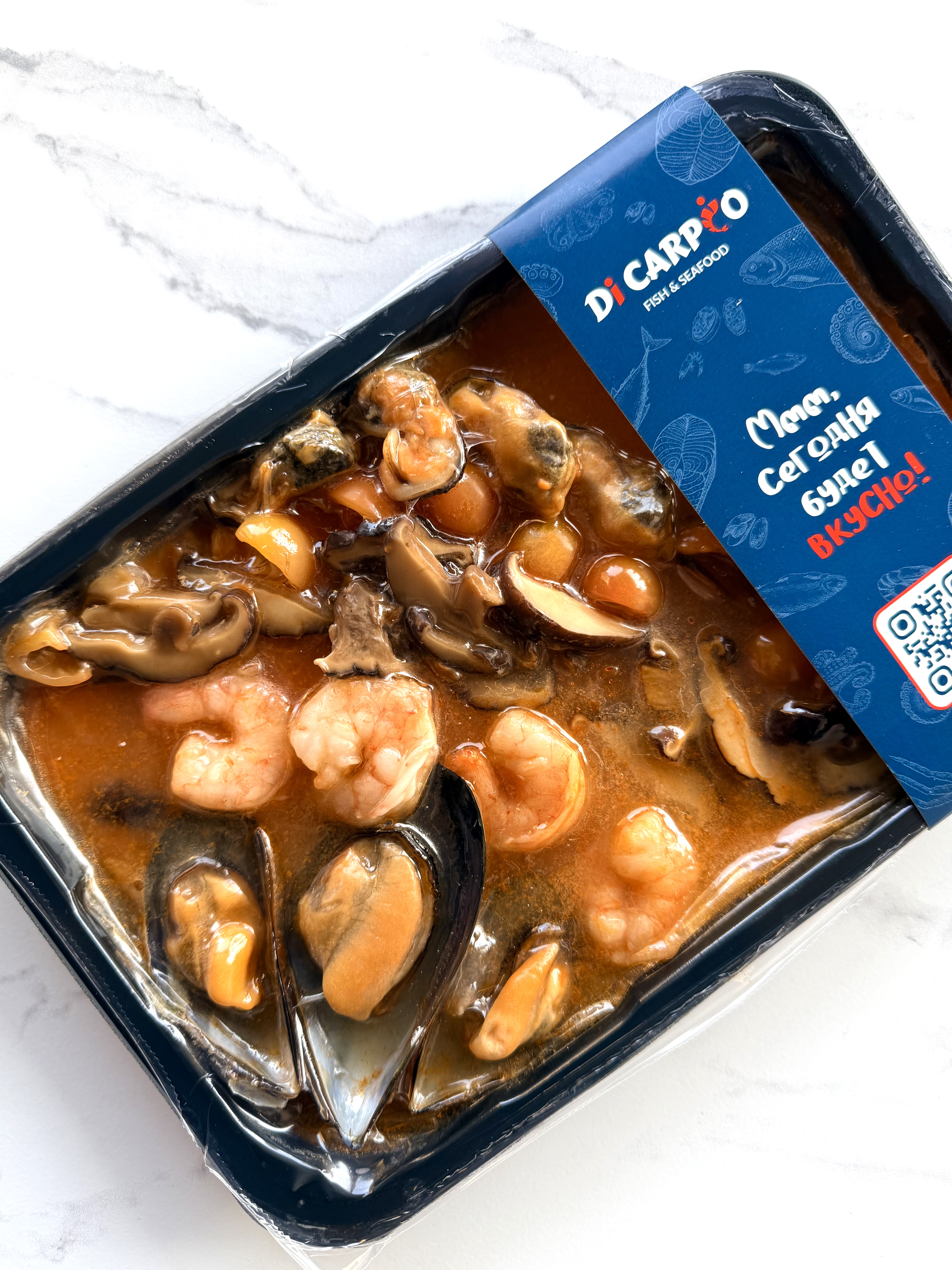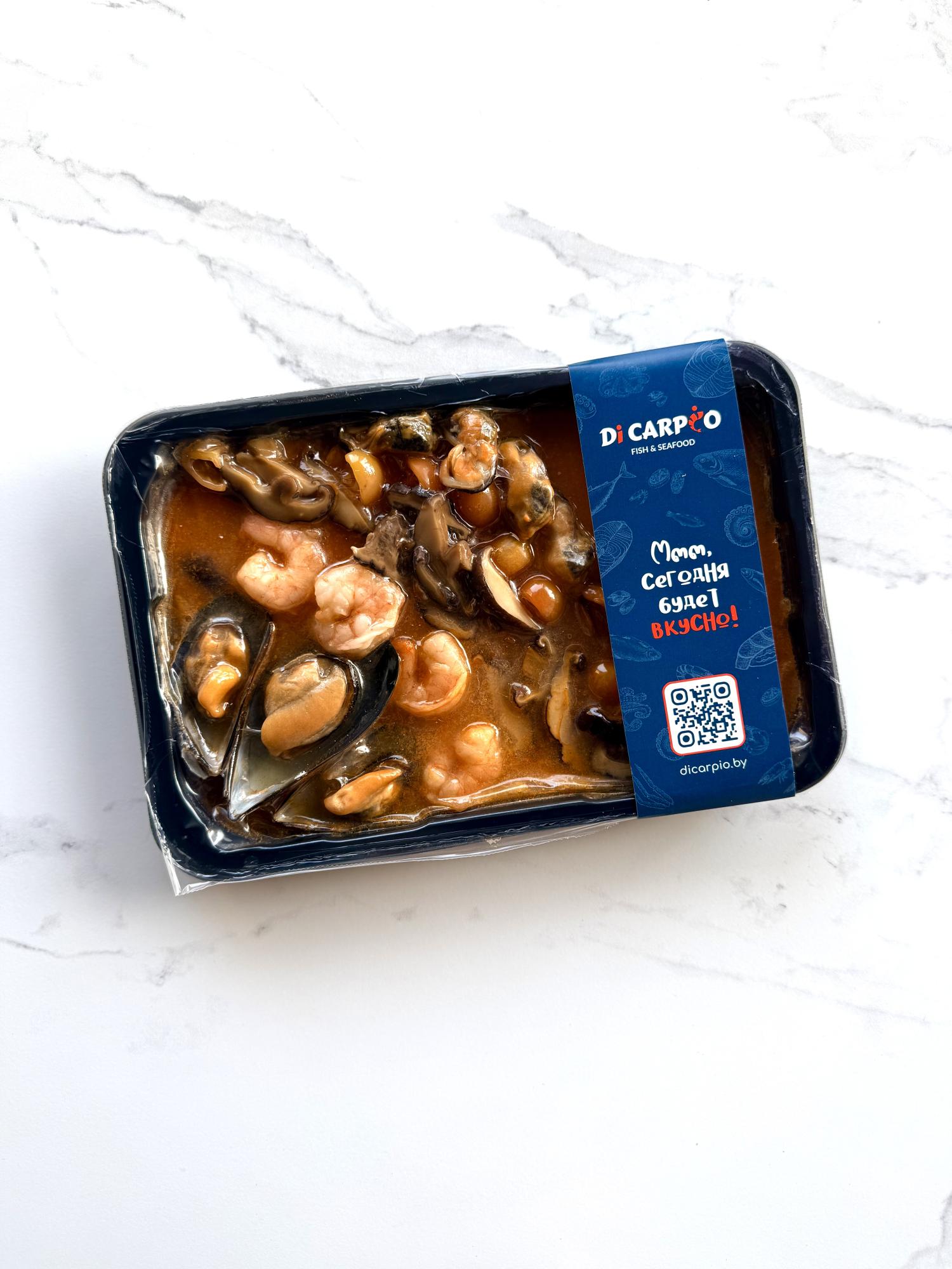рыбный бульон (вода питьевая, минтай мороженый б/г, лук репчатый свежий, морковь свежая, лук порей свежий, петрушка свежая, укроп свежий, перец черный горошек, лавровый лист целый), мидии синие на половине раковины свежемороженые, креветка ваннамей очищенная без хвоста мороженая, мясо мидий варено-мороженое, паста Том Ям (лемонграсс 24%, соевое масло, лук-шалот, сахар, паста из тамаринда, красный перец чили сушеный, галангал, чеснок, соль, регулятор кислотности лимонная кислота, рыбный соус (экстракт анчоуса, соль, вода, усилитель вкуса и аромата глутамат натрия 1-замещенный, креветочный порошок, каффир-лайм)), кокосовое молоко 17-19% SUNFEEL, томат черри свежий, имбирь корень свежий, грибы сушеные «Шиитаке», рыбный соус AROY-D (экстракт анчоуса 72%, соль, сахар), лайм свежий, перец острый свежий стручковый красный Чили, масло растительное, чеснок свежий, трава лемонграсс сушеная. |